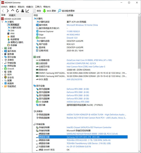 显卡为英伟达RTX 2080独立显卡,内存为2 x 16GB DDR4-2666MHz双通道。
