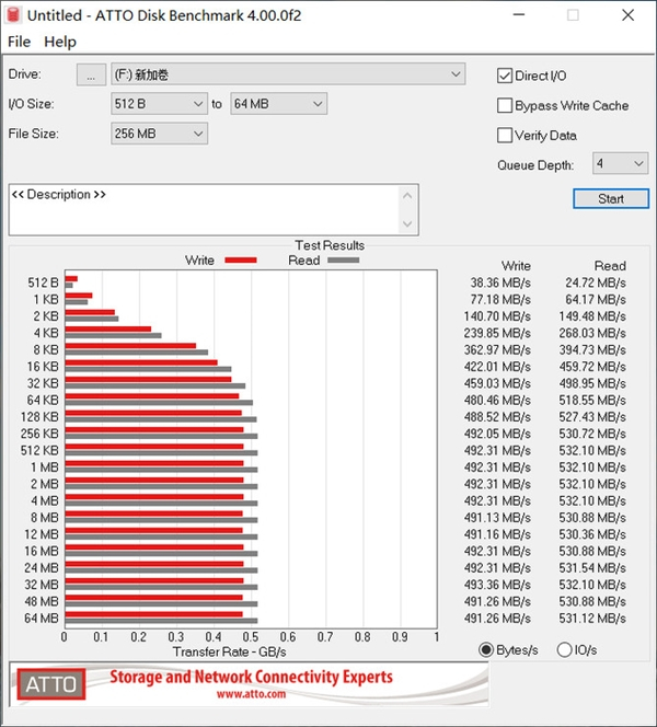 在ATTO Disk Benchmark测试中,870 QVO的最大读取速度为532.10MB/s、最大写入速度为493.36MB/s,同样非常出色。