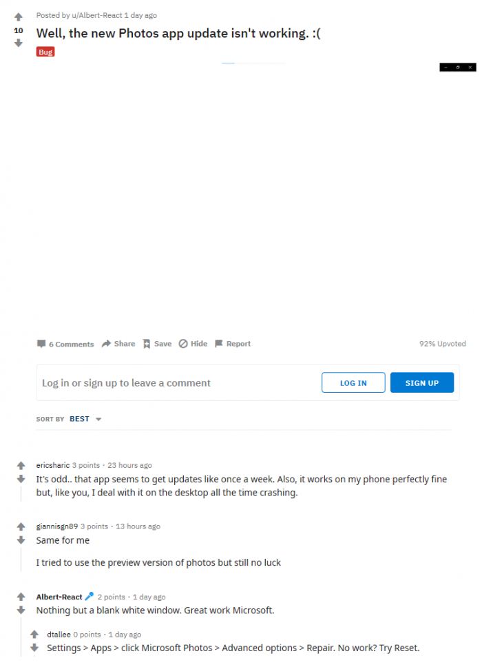 Reddit上有人说,他们尝试了几乎所有的方法来修复照片应用,但并非都有效。所以要想让所有用户的照片应用恢复到完全正常的状态,唯一的办法就是微软尽快推送新的更新。