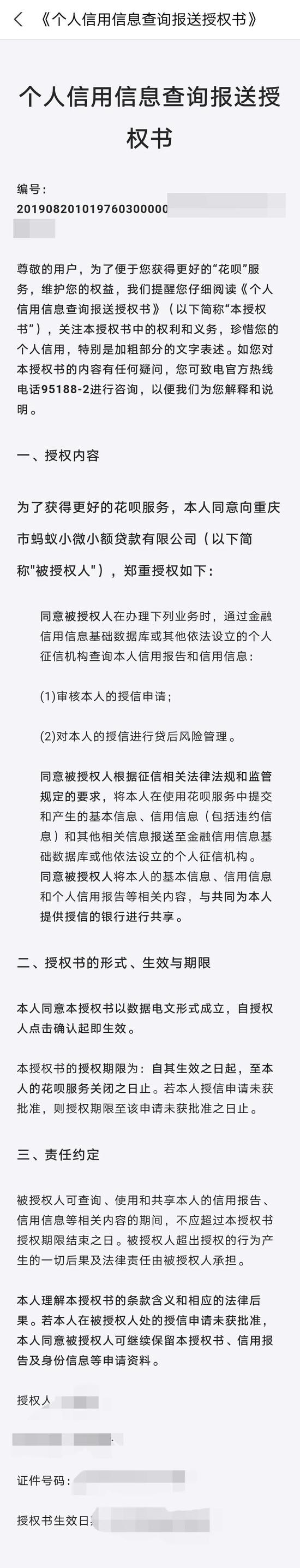 从6月开始,一些花呗用户陆续收到了花呗服务升级的通知,内容显示为:为持续向您提供优质的花呗服务,根据相关法律法规及监管要求,需要确认完成本次升级。其中,征信报送的授权书就在此次升级服务的内容中。