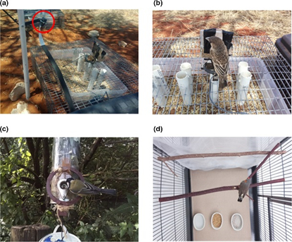 在野外和圈养环境中自动收集训练数据的示例。 (a)Pi摄影机(红色圆圈),用于记录鸟类的后背图像。(b)训练识别群居织巢鸟( sociable weaver)的数据图片示例 (c)训练识别大山雀(great tit)的数据图示例。(d)训练识别斑胸草雀(zebra finch)的数据图片示例