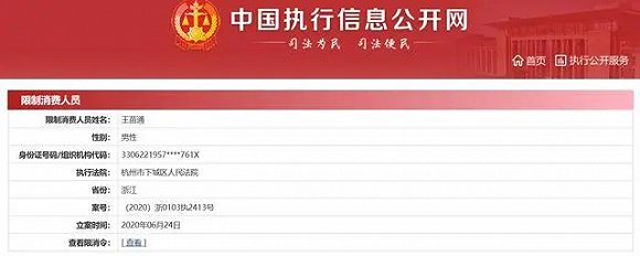 6月30日,杭州市下城区人民法院签发对世纪华通(002602.SZ)董事长、法定代表人王苗通及世纪华通控股股东浙江华通控股集团有限公司(下称"华通控股")消费限制令。