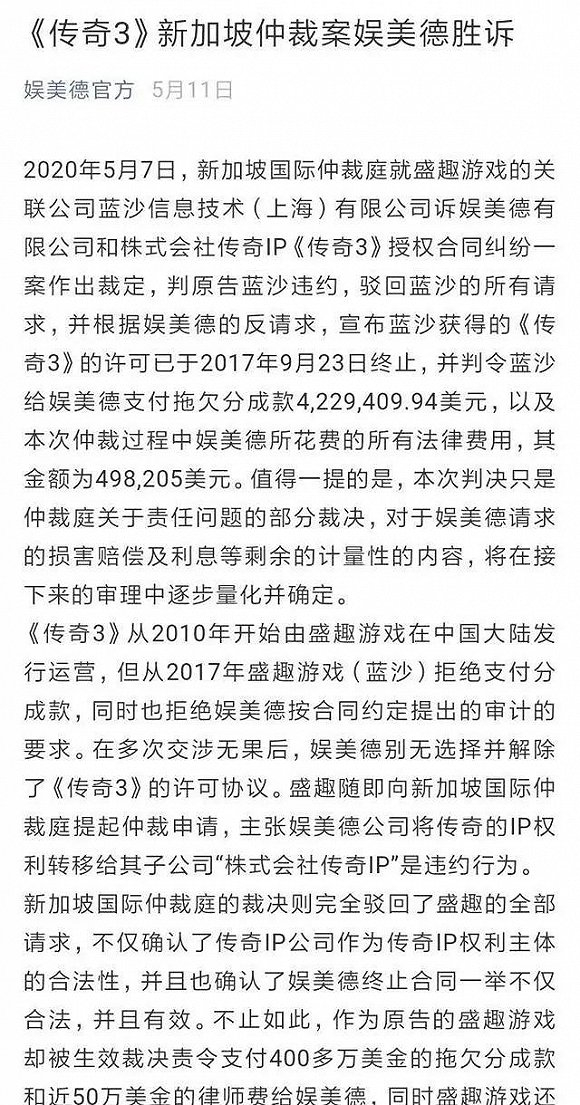 根据娱美德官方消息,2020年5月7日,新加坡国际仲裁庭(下称"ICC")就盛趣游戏的关联公司蓝沙信息技术(上海)有限公司诉娱美德有限公司和株式会社传奇IP《传奇3》授权合同纠纷一案作出裁定,判原告蓝沙信息违约,驳回蓝沙信息的所有请求,并根据娱美德的反请求,宣布蓝沙信息获得的《传奇3》的许可已于2017年9月23日终止,并判令蓝沙信息给娱美德支付拖欠分成款422.94万美元,以及本次仲裁过程中娱美德所花费的所有法律费用,其金额为49.82万美元。
