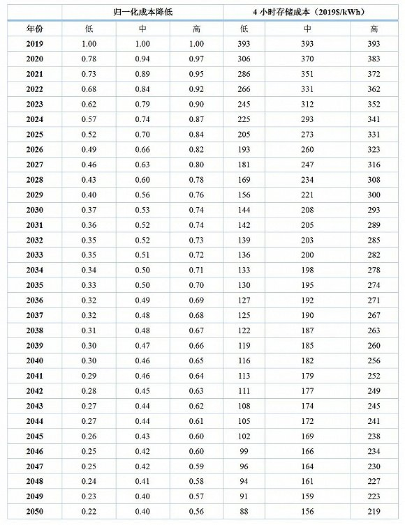 NREL的研究显示,根据其低、中、高三个版本的成本预测,到2030年,4小时电池储能系统投资成本将会下降到$144/kWh、$208/kWh和$293/kWh;到2050年,将会达到$88/kWh、$156/kWh和 $219/kWh。