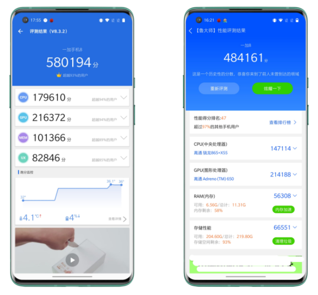 在跑分数据上,一加8的安兔兔总分580194分;鲁大师为481461分,在骁龙865机型当中属于偏上的水准。