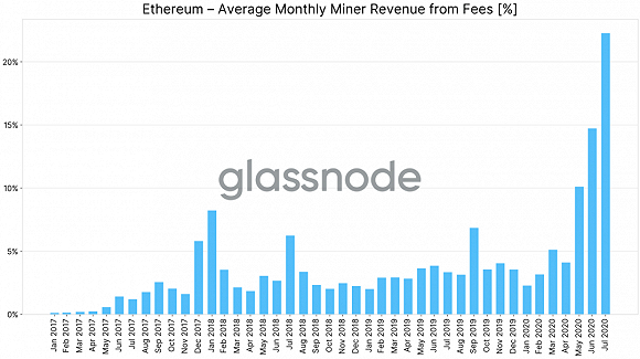 Glassnode数据显示,7月份交易费占以太坊矿工收入的比重达到22.2%,创历史新高。