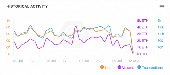 最近一周,Uniswap的热度已经开始直线下滑,最明显的是用户数、交易量、转账数都在下滑。