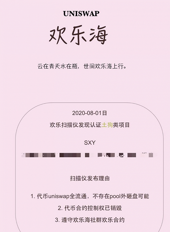 一个叫做欢乐海的社区,据称建群一天就满了。推荐的第一期项目SXY,最高上涨700倍,但截止写稿时,SXY价格距离高点已经腰斩,24小时交易量大跌92%。