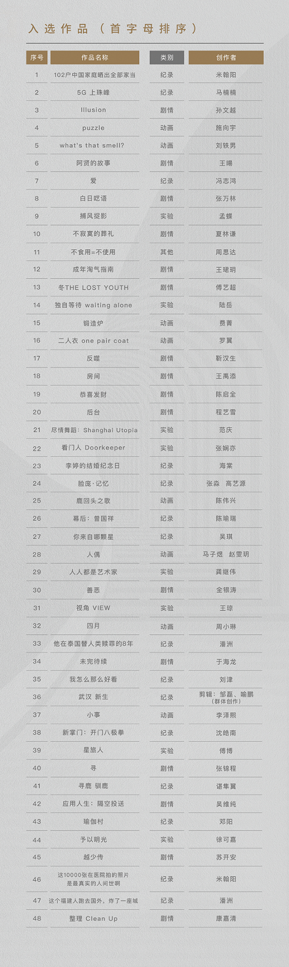 周子阳:到我们这里有48部片子,我们需要从48部里面选择5个奖项。我们会给每部片子都打分,根据我们5个评委的分数,从高到低排20个。只要进了前20,都算优秀推荐影片。我们评委再在20部里,选出5部。