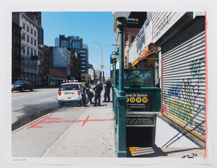 “Chinatown Police 2020.4.26”中,刘小东将一组警察画在中国城的街道上。