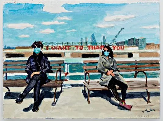 2020年4月9日,刘小东画了这幅“Thank You 2020.4.9”,妻子和女儿坐在河边长椅上。疫情期间,即使是母女,也要保持社交距离。