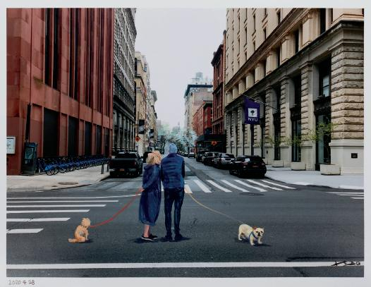在照片上介入是一种方式,更多的则是画布内部的挪移。谈及“NYU 2020.4.28”这件取材于纽约大学图书馆外景的作品,刘小东说:“那儿完全是一个空景,街上没有人。后来我在西村看见两个老人在街角聊天——这两个老人,我在想怎么用呢?我觉得放在大学旗子下面是最美的。他们有一个年龄的差异,从前这里走过去都是年轻人,现在一个人都没有了。老人那种可爱的背影和两只很耐心的狗,我觉得画在这里很合适。”
