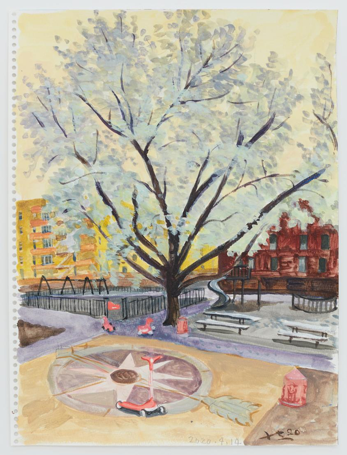 保持着这份敏锐的观察,刘小东创作了一系列水彩作品,记录过去4个月里城市的变化:无人的游乐场、空荡的街道、落花的树木、普通的陌生人、“闹革命”的美国人、刘小东的妻子和女儿的身影……2月起,刘小东因航班限制而滞留美国,无法返回北京。在这个春天里,他画笔下的纽约伤感而温暖。