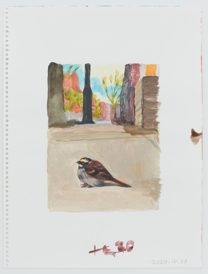刘小东在“The Sparrow who does not fly 2020.4.23”里画了一只不用飞翔就可以在城市中生存的麻雀。