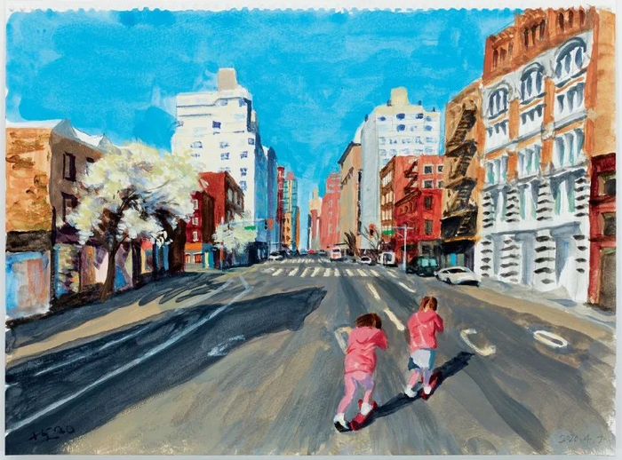 2020年4月7日,刘小东画了一对姐妹穿过纽约空荡的街道。