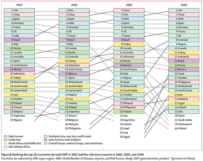 《柳叶刀》(THE LANCET)总编Dr Richard Horton补充说:“这项重要的研究绘制了一个我们亟需规划的未来蓝图。它为地缘政治力量的根本性转变提供了一个预测,挑战了有关移民的迷思,强调了保护和加强女性的性权利和生育权利的重要性。21世纪将见证人类文明史上的一场革命。非洲和阿拉伯世界将对我们的未来产生重大影响,而欧洲和亚洲的影响力将减弱。到本世纪末,世界将是多极化的,印度、尼日利亚、中国和美国会成为主导力量。这将是一个真正的新世界,一个我们今天就应该为其做好准备的新世界。” [2]