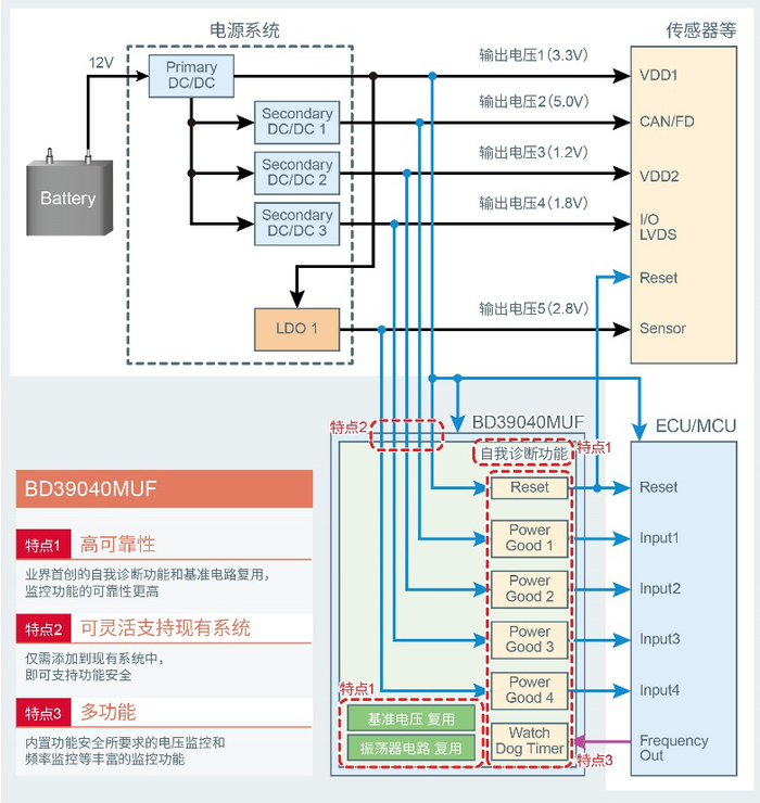 图2 罗姆的电源监控IC“BD39040MUF”框图内置各种监控功能和自我诊断功能,可为现有电源轻松添加功能安全性。