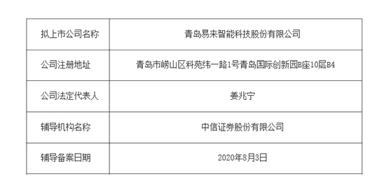 青岛资本圈从青岛证监局获悉,青岛易来智能科技股份有限公司(以下简称“易来智能”)上市辅导已备案,辅导机构为中信证券。