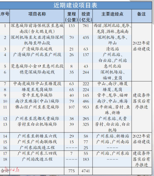 根据批复,近期建设的18个项目中,涉及广州的共12个,包括城际铁路7条,枢纽工程5个,累计里程424公里,总投资2869亿元。其中,2条城际铁路、3个枢纽工程计划2022年之前启动建设,其余项目在建设条件落实后有序推进。