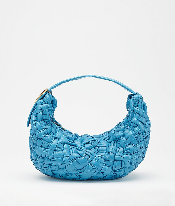 在此前Bottega Veneta多款包袋中常见的整齐且干净的Intrecciato编织技法在BV BANANA系列中被彻底打乱,混沌交错的皮革线条展现出了因打结而成的细微褶皱,使包袋外观更有力量感,其中的鲜红款近看更是有着一种像是被血液涂抹后的爆裂感。而在天蓝色青蓝色两款包袋中,这种别致的交缠设计却显得十分冷静,其表面看起来就像是堆满了冰块的荒原。