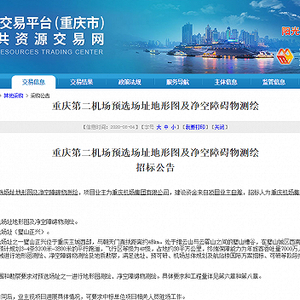 《公告》显示,此次招标工程名称为:重庆第二机场预选场址地形图及净空障碍物测绘。建设地点在重庆第二机场预选场址璧山正兴。