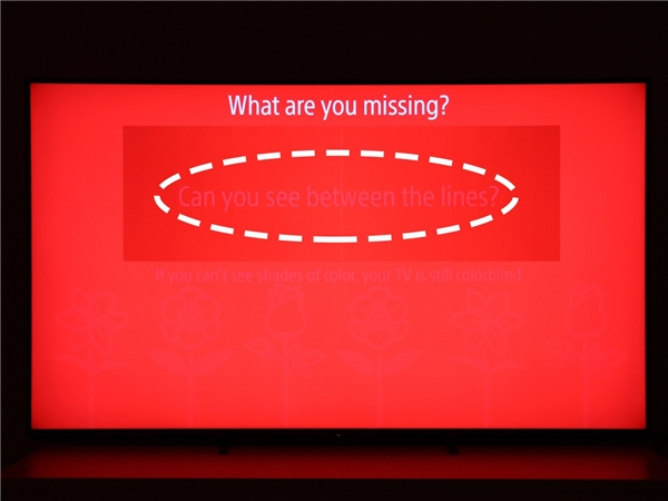在纯红色的背景下,Z8H可以显示出更多的色彩内容,尤其是图中的黑框和三星Q950TS的黑色色块相比来说过渡更加自然,我们也可以看到黑框中的字体,甚至仔细观察的话还可以看到黑框下还有别的文字内容以及底边部分的花朵线条。这些内容在三星Q950TS上都是显示不出来的,仅有在标准模式下才能看到。