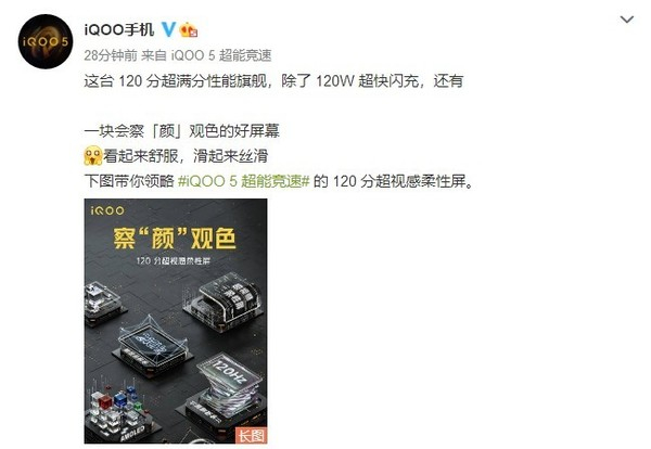 原标题:iQOO 5系列不仅支持120W快充:还将配120分超视感柔性屏