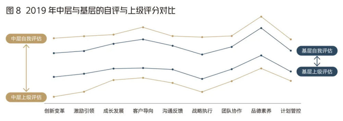 图8中我们也可以明显看到,中层管理者的自我评估与上级评估差距扩大,大幅拉低了中层管理者的总得分。我们建议企业要尽量排除“预期拔高”的影响,从客观角度进一步考察中层管理者的实际能力水平;同时也需要注意在给中层“加码”目标责任要求时,把握好节奏和力度,避免目标考核的摆动幅度增大,缓解中层管理者压力过大、信心下滑或者过度忧患的情绪。