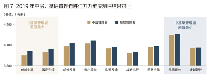 通过对2019年调查数据的拆解,我们发现了一个特别值得关注的现象,即中层管理者的胜任力得分全面低于基层管理者,而在前两年的调查结果中,中层管理者的胜任力得分除个别维度外,总体都是领先于基层管理者的(见图7)。导致这一现象的原因,我们认为是由于企业在面临外部挑战,或处于转型变革过程中,中层作为战略的第一接收层、执行层和责任层,被寄予了全面推动战略落地、有效调配资源、确保信息顺畅流通的厚望,对他们在创新力、变革力、团队引领力等方面的要求也相应提高。