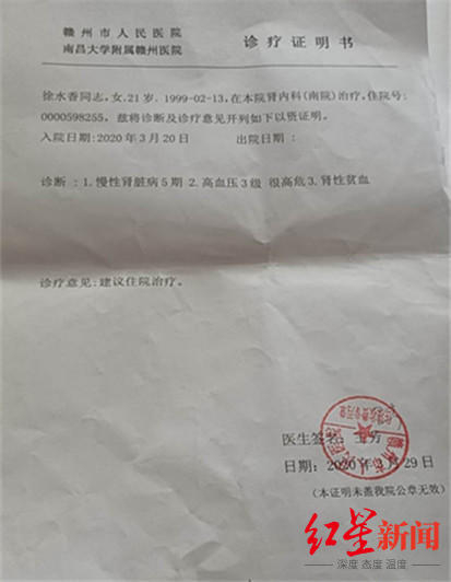徐水香回忆,家里一年都吃不了几顿肉,都是吃地里种的菜,由于家里条件不好,自己因此营养不良。随着小徐慢慢长大,13岁时,她发现自己的脚、手及眼睛都出现了不同程度的肿胀,检查后才知患上了肾炎。2017年在广州打工时,她身体又出现不适,“全身浮肿,肚子里还有几十斤腹水。”检查后医生才告诉她得了肾病综合症,需要进行肾穿刺,也需要按时服药。而贫困的生活加上每月的医疗费,让她不得不一边上班一边治病,“不上班就没有药吃。”因此,治疗也时断时续,最终恶化为尿毒症。