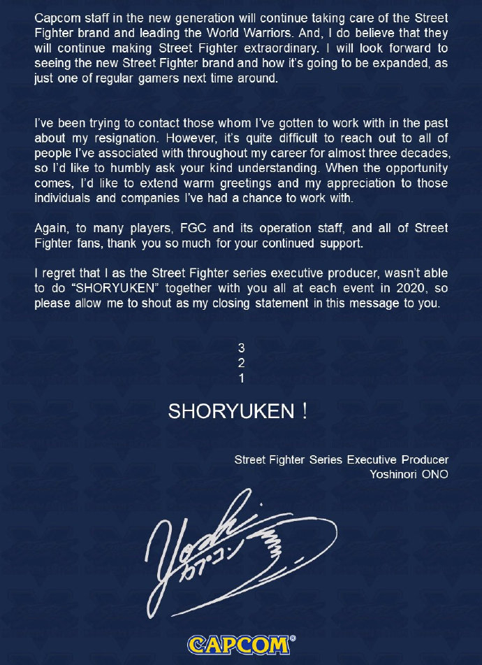 《街霸》系列制作人小野义德将离开Capcom 任职近30年