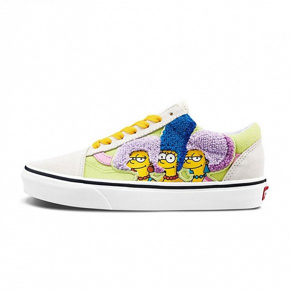 女款Old Skool采用马卡龙色组合,鞋上印有Marge的好姐妹:双胞胎Patty和Selma。人物的头发部分采用毛织材料,增添减龄效果。