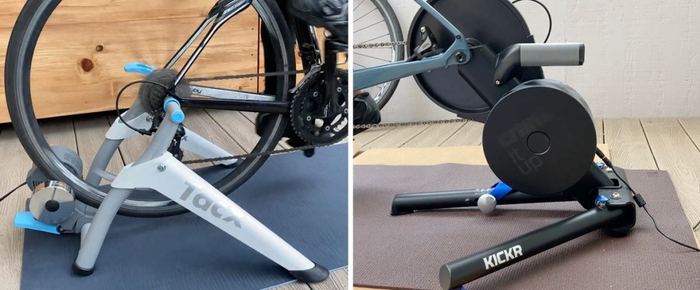 我测试了两种不同价格的型号:370 美元的 Tacx Flow Smart 和 1200 美元的 Wahoo Kickr。Flow Smart 是一款轮式教练机,安装简单。只需卸下后叉即可开始骑行。Flow Smart 旋转起来像巨大的大风扇在呼啸,而价格较高的 Kickr 则有更安静的嗡嗡声。我更喜欢后者(我确定楼下的邻居也这么想)。
