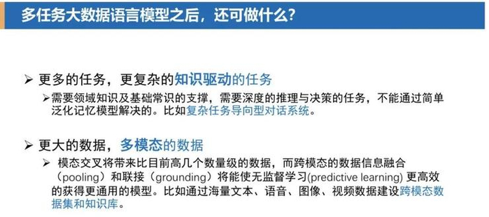 我认为AI不仅可以进行简单的浅层的任务,还可以尝试更多需要知识驱动的任务,比如复杂的任务型的对话系统。这类任务需要领域知识及基础常识的支撑,需要深度的推理与决策,不能通过简单泛化记忆模型来解决。另外一个是多模态数据。模态交叉将带来比目前高几个数量级的数据,而跨模态的数据信息融合 (pooling)和联接(grounding)将能使无监督学习(predictive learning) 更高效的获得更通用的模型。比如通过海量文本、语音、图像、视频数据建设跨模态数据集和知识库。多模态数据可能可以帮助我们的模型超越语言,跟实体世界进一步结合,帮助我们更好地获得人类世界的知识。