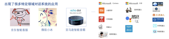 产业界对人机对话系统的需求很大。在过去的几年里也出现了一些特定领域的应用,比如京东的智能客服、微软小冰、亚马逊智能音箱等等。我们发现在特定领域确实对话系统通常表现好,在很多时候能提升我们的工作效率,降低工作成本,甚至可以提升顾客体验。但是在开放领域、对可靠性有很高要求的时候,对话系统还是一个很大的挑战。