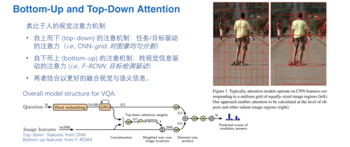 我们还模拟人的注意力机制提出了“bottom-up and top-down attention “ 机制,让语言和视觉跨模态的信息融合和理解更高效。