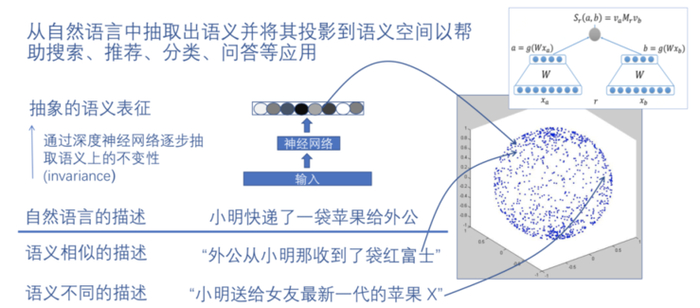 除了分辨意图之外,我们还要对自然语言的语义进行表征。我们需要把每一个自然语言的描述(最好能把它的语义)用一个向量提取出来,在同一个语义空间表示。当不同的人表达不同的方式时,只要意图相近就很容易判断出来。