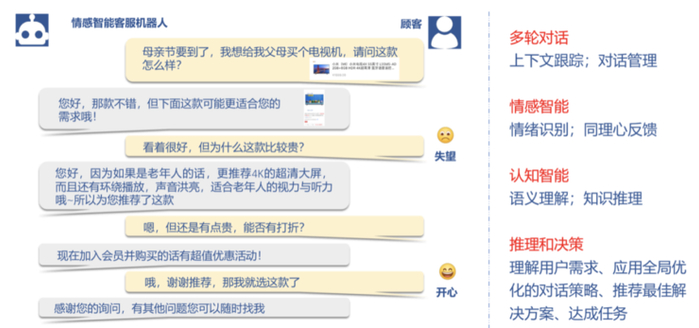 在用户在与机器人导购或销售聊天时,表层是交互、关怀、交流,但在底层则需要大量的技术支撑,包括多轮对话管理、认知智能、情感智能和推理与决策等。
