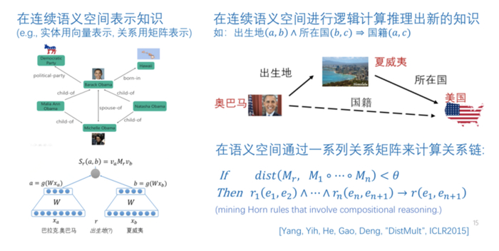 另外,我们可以通过在连续空间里面投影我们的知识,再把这个知识的点和整个知识图谱都投影到一个连续语义空间里面,在这个空间里面做很多直接的计算,判断这个知识的一致性,并进行知识的补全。