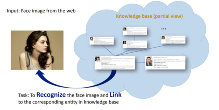 我们还可以通过建立跨模态知识库连接视觉、语言和实体的信息。这是我们之前做的一个全球名人数据库 “MS-Celeb-1M”(见下图),把人的图像信息和知识图谱里面的实体信息进行连接。在这张图片里,我们不光识别出一个人,我们还知道她是1982年出生的,是一个美国人,在某一个剧里演了某个角色,这样我们对这个实体的人的了解知识迅速丰富起来。