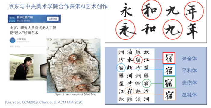 大家知道《兰亭集序》开头的4个字“永和九年”(如下图)。这里面有4个字是王羲之写的,另外四个是AI模仿王羲之的风格写的。大家能看出哪些是王羲之胁的,哪些是AI写的?确切来说,圈出来的字是AI写的。AI书写还有一些瑕疵,比如“九”字是有瑕疵的,“和”“年”这两个字则十分完美。而且AI还可以写出带有不同情绪的书法,兴奋时写得比较轻快,悲伤时写得比较顿挫。