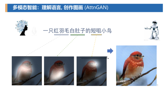 我们还可以先理解语言再创作图画。我们把“一只红羽毛白肚子点短咀小鸟”这句话梳理文字给AI的时候,有没有可能AI在画这只小鸟的时候,学会对应看那个语言对应的语义,知道什么地方应该画什么颜色,比如肚子上要画白色,羽毛上画红色,在头部画一个短嘴,最后凭空合成这么一张小鸟图片。