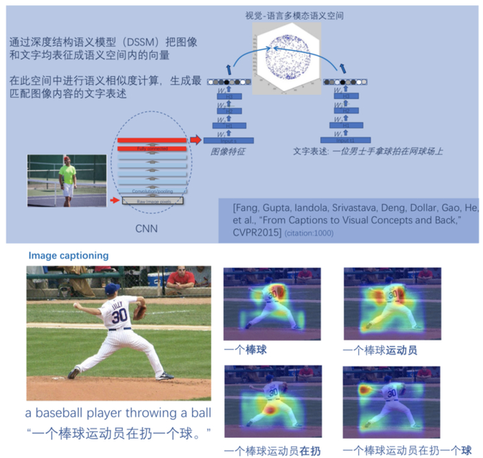 基于新的深度学习模型,我们有可能把不同模态的信息投影到统一的语义空间,在这个空间里面做很多计算,帮助我们从各个角度理解这些信息。比如说,把文字和图片投向同一个空间,这样很快就可以知道文字和图片是不是描述同样的意思,然后生成一张图片,迅速用语言模型来描述它真正的视觉信息,帮助我们更好地理解语言和视觉之间的互相管理。