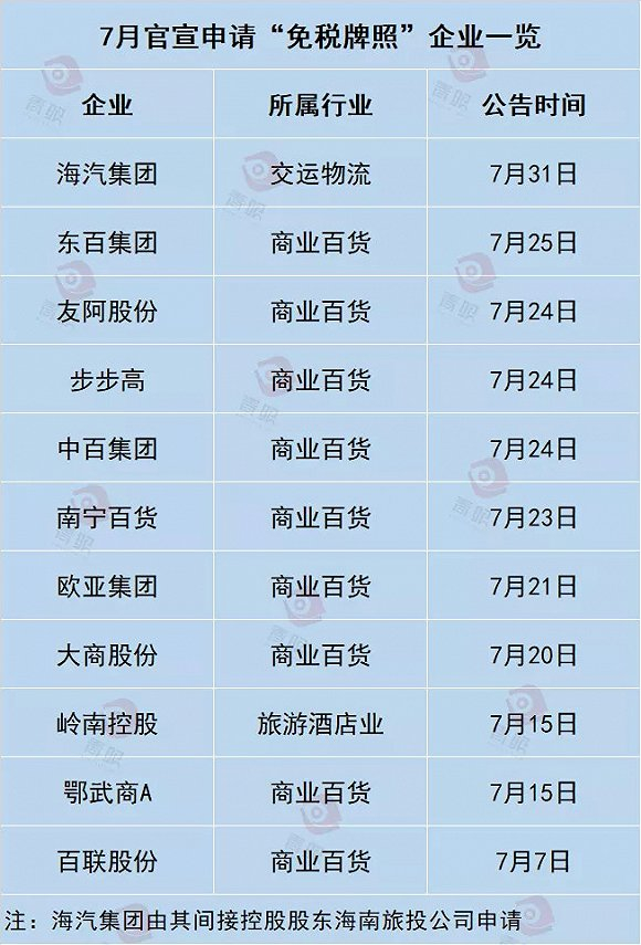 据青眼不完全统计,7月以来,已有百联股份、岭南控股、东百集团等共11家企业申请免税牌照,尤其是7月24日一天,就同时有友阿股份、步步高、中百集团表态企业已行动起来,将免税概念推向一个新高潮。