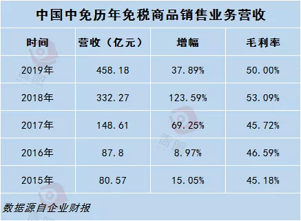 从中国中免财报来看,自2015年以来,中国中免旗下的免税商品销售业务实现暴涨,尤其是在将日上免税收入囊中后,不仅规模翻倍,增速也提上一个新高度。其中2018年,中国中免免税商品营收达332.27亿元,同比增长123.59%,较2015年规模翻3倍,毛利率则始终保持在45%以上。