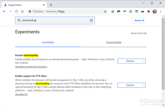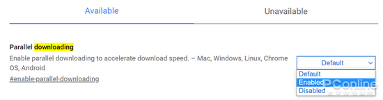 然后按下回车键,就可以看到Chrome的实验功能了。在搜索栏中搜索“downloading”,可以看到一个“Parallet download”的选项,这是多线程下载的意思。这个选项默认是处于“Default”档位关闭的,将它改成“enable”,就可以开启Chrome的多线程下载支持了。