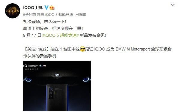 据悉,全新的iQOO 5性能旗舰将于8月17日正式发布。更多详细信息,我们拭目以待。