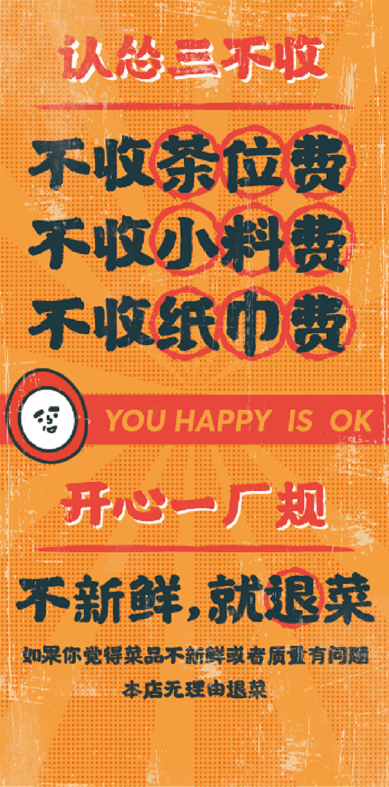 门店还挂出了“认怂123”的三条规矩:茶位不收费、纸巾不收费、调料不收费……