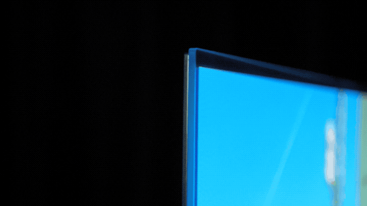 而形成玻璃板视觉的原因在于,这台电视采用了小米擅长的全面屏设计,同时由于不需要背光模组,让侧面看起来非常薄,甚至不足 1cm(官方数据为 5.7mm)。基本上就是两层玻璃盖板夹着 OLED 层。不过面向观众的正面会有一圈金属边框包边。
