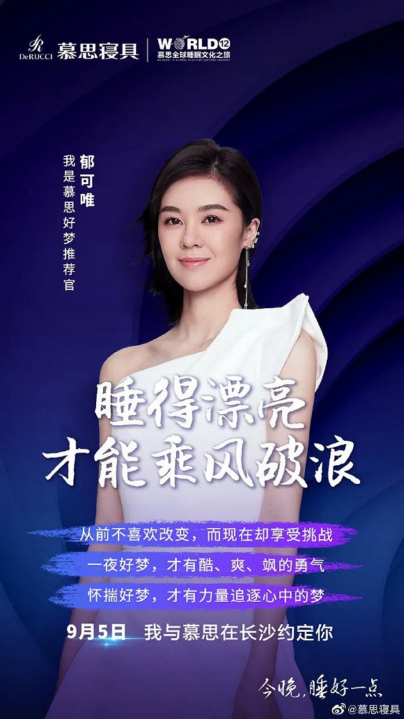 8月12日,慕思寝具宣布郁可唯成为好梦推荐官。